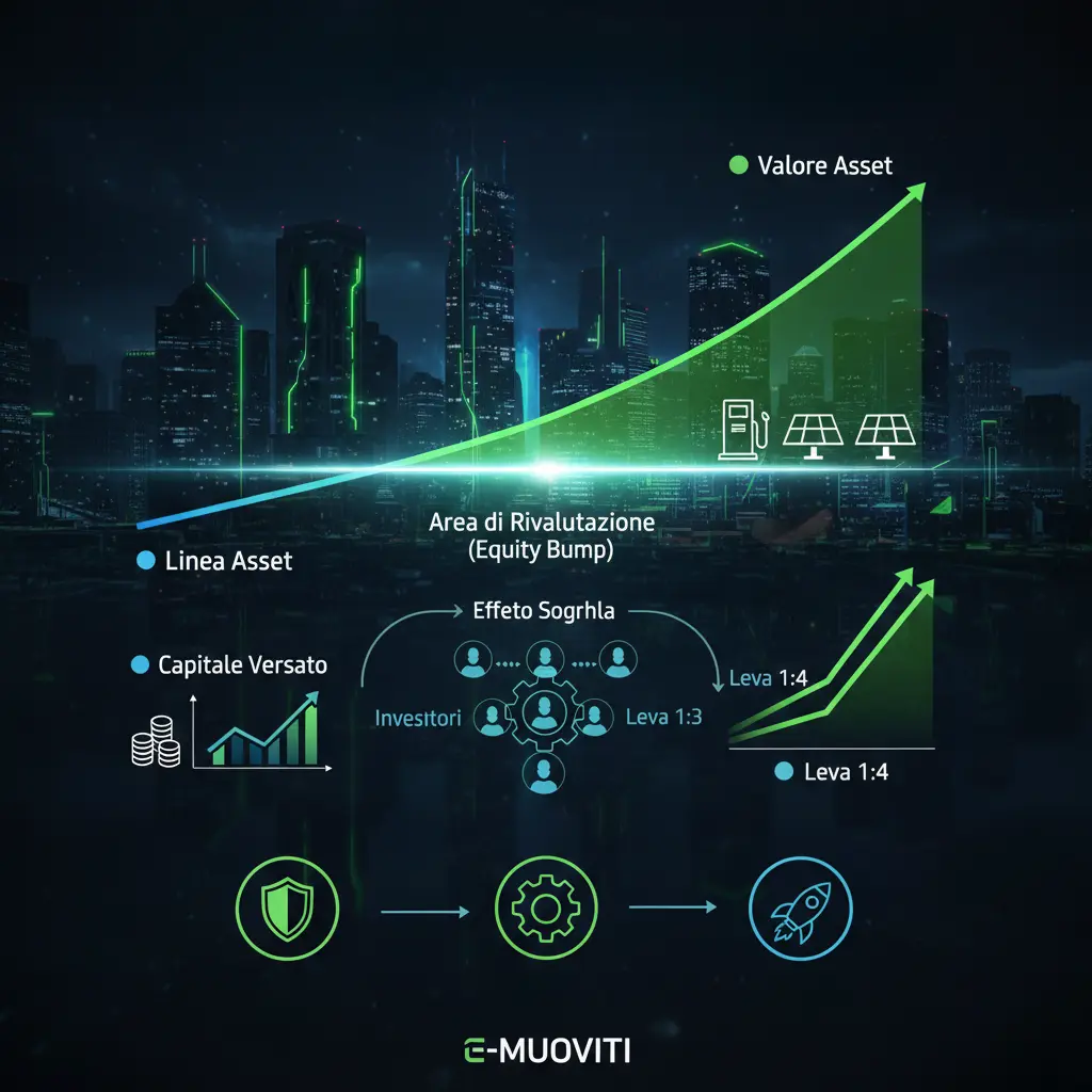 La magia finanziaria avviene nello spazio tra queste due linee: l'Area di Rivalutazione (Equity Bump). Grazie a una struttura di leva finanziaria ottimizzata (inizialmente 1:3), ogni euro versato dall'investitore attiva risorse bancarie e istituzionali che moltiplicano la potenza di fuoco del progetto. L'investitore non possiede solo la sua "quota", ma una frazione di un asset molto più grande, garantendo una protezione del capitale che non ha eguali nei mercati azionari tradizionali.